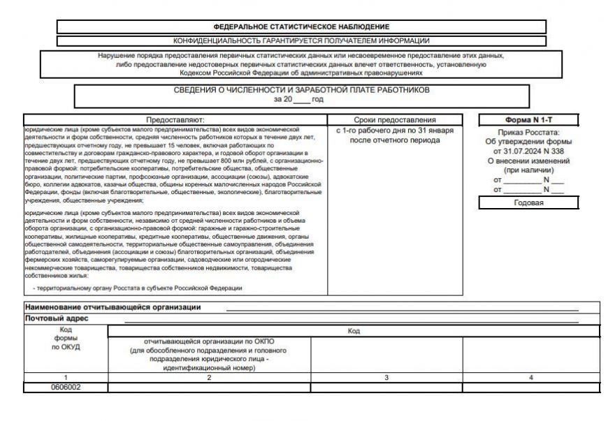 Форма 1-Т заполняется на основании данных о численности работников и начисленной заработной плате за определенный период. Отчет подается в территориальные органы статистики и используется для формирования статистической информации о рынке труда.