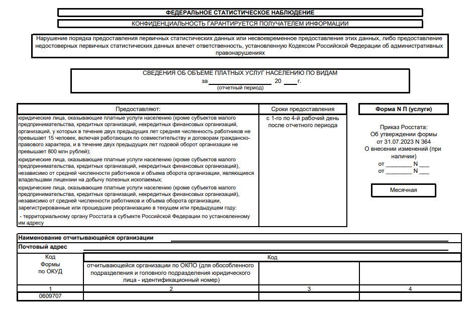 Форма П (услуги) — это важный инструмент для сбора статистических данных об объеме платных услуг, оказываемых населению. Ее заполнение требует внимательности и точности, а несдача может привести к штрафам.