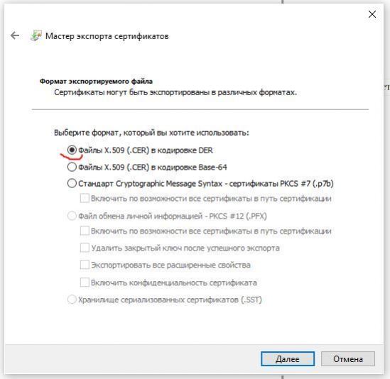 По нажатию этой кнопки активируется «Мастер экспорта сертификатов». Галочка должна стоять, как на странице ниже. Пользователю остается нажать кнопку «Далее».
