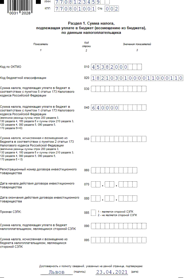 Раздел 1 относится к итоговым. Здесь надлежит обозначить сумму налога к уплате либо возмещению из бюджета.